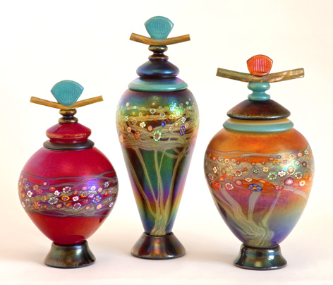 Lidded vessels with hand drawn hot glass tree and vines decoration, as well as a field of our hand-formed floral murrini. |