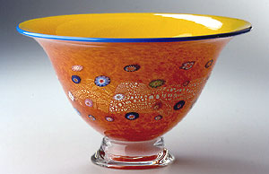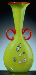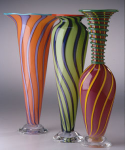 colored hand blown glass vessels with hand formed murrini decorations. |